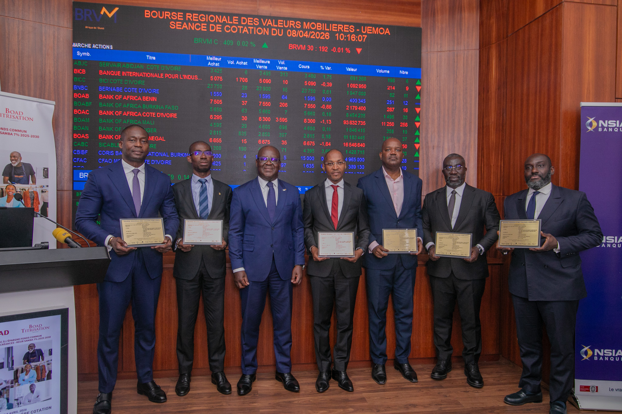 Le 8 avril 2026, la Bourse Régionale des Valeurs Mobilières (BRVM) a procédé à la double cérémonie de première cotation des Fonds Communs de Titrisation de Créances (FCTC) « FCTC KEUR SAMBA NSIA BANQUE CI 7,00 % 2025–2030 » et « FCTC KEUR SAMBA ORABANK CI 7,00 % 2025–2030 ».