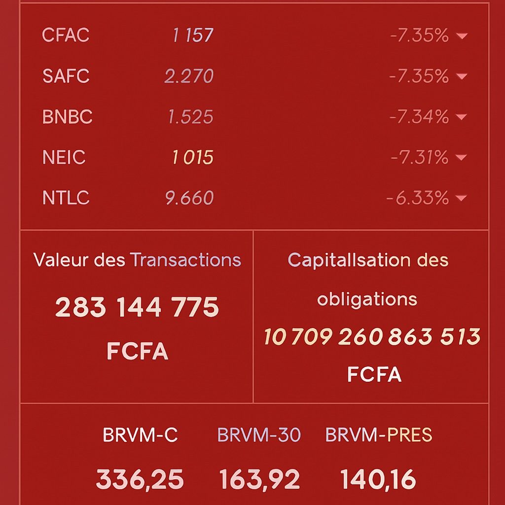 Les plus fortes baisses de la séance concernent des titres affectés par des résultats décevants ou des perspectives incertaines. CFAC : 1 575 FCFA (−7,35 %), SAFC : 2 270 FCFA (−7,35 %), BNBC : 1 325 FCFA (−7,34 %), NEIC : 1 015 FCFA (−7,31 %) et NTLC : 9 660 FCFA (−6,58 %).