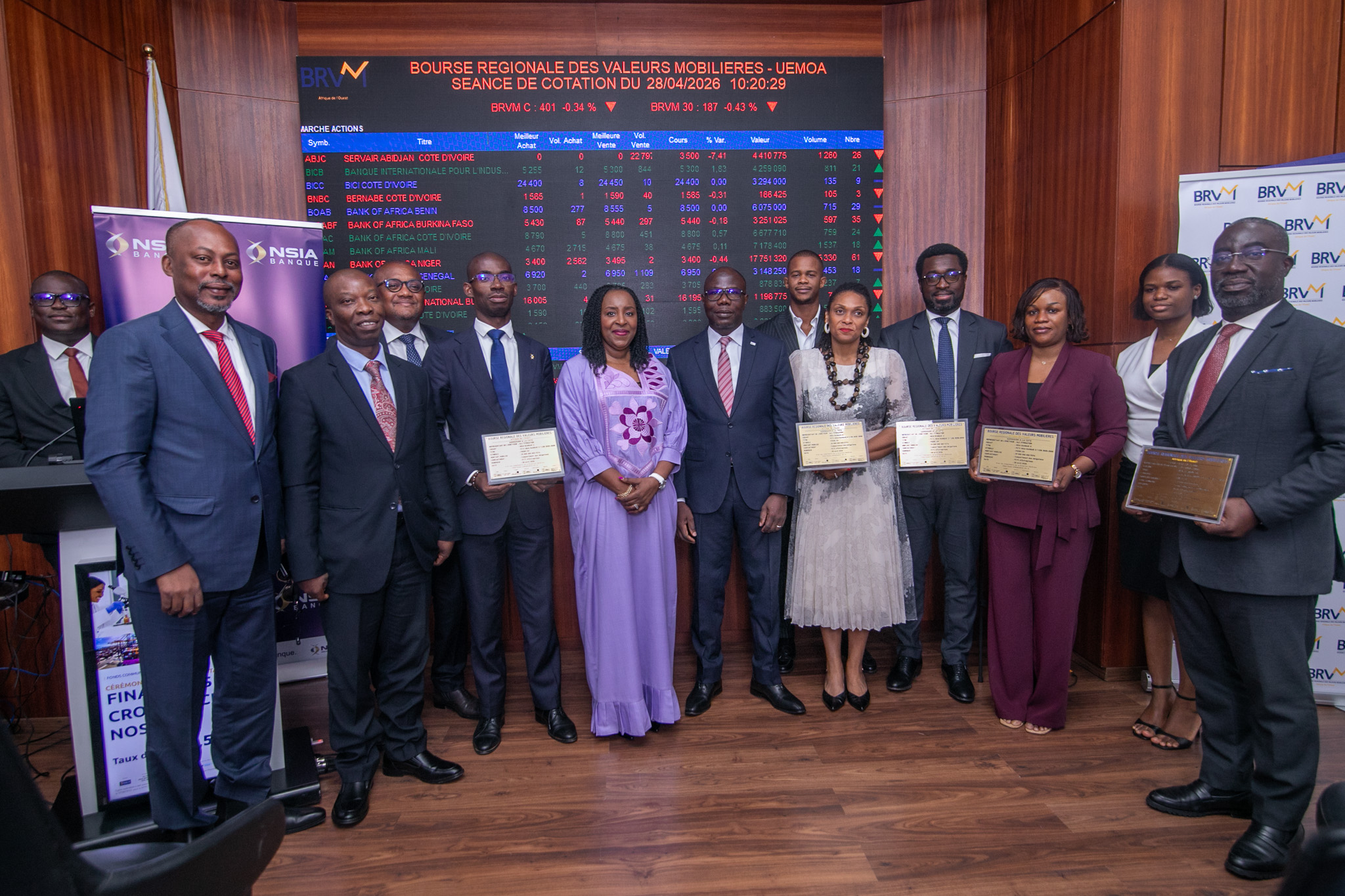 La Bourse Régionale des Valeurs Mobilières (BRVM) a franchi une nouvelle étape ce mardi 28 avril 2026 en procédant à la première cotation des obligations issues du Fonds Commun de Titrisation de Créances (FCTC) baptisées « FCTC NSIA Banque 7,5 % 2025–2030 ». La cérémonie officielle, organisée au siège de l’institution à Abidjan, a marqué un moment fort dans le processus de modernisation et de diversification des instruments financiers disponibles sur le marché régional.